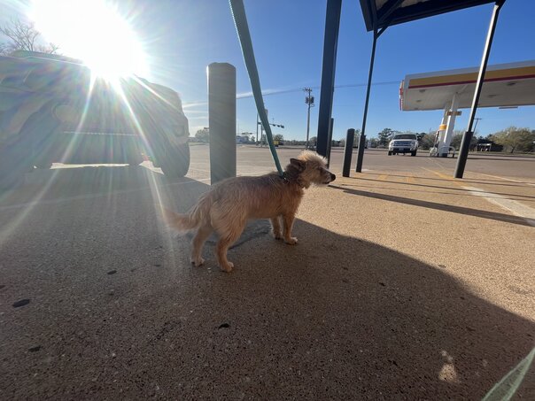 About halfway through the trip and somewhere in Louisiana, we stopped for some gas and caffeine and Rachel came upon a stray cat that was dumpster diving. Always the lover of felines, she grabbed some canned tuna for said cat and we spent a short while making sure it had a meal.