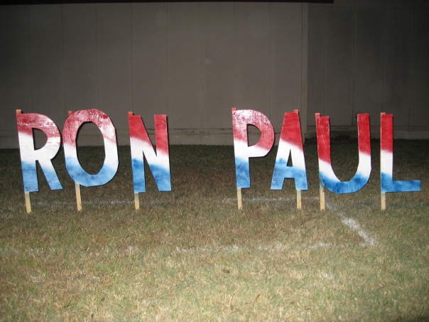 After I cut all of the letters out with a jigsaw I attached stakes on the backs of them and staked them into my yard. A little bit of red, white, and blue paint at a diagonal, and voila, a Ron Paul sign was born.