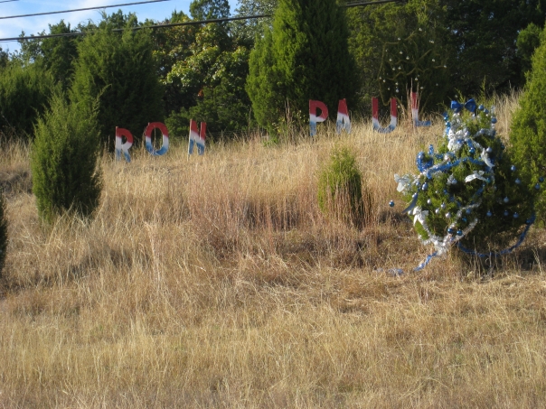 After I cut all of the letters out with a jigsaw I attached stakes on the backs of them and staked them into my yard. A little bit of red, white, and blue paint at a diagonal, and voila, a Ron Paul sign was born.