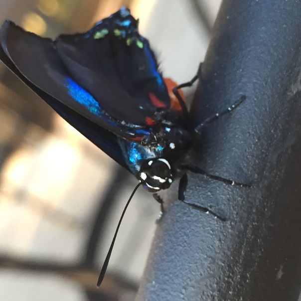 A butterfly with vibrant jewel-tone wings of blue and black is seen up close.