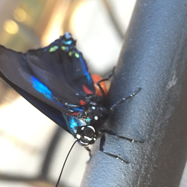 A black beautiful butterfly is looking for its prey by sitting on a rod