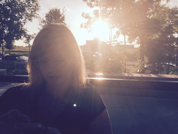 A woman wearing glasses is looking at her cell phone as the sun shines brightly behind her.