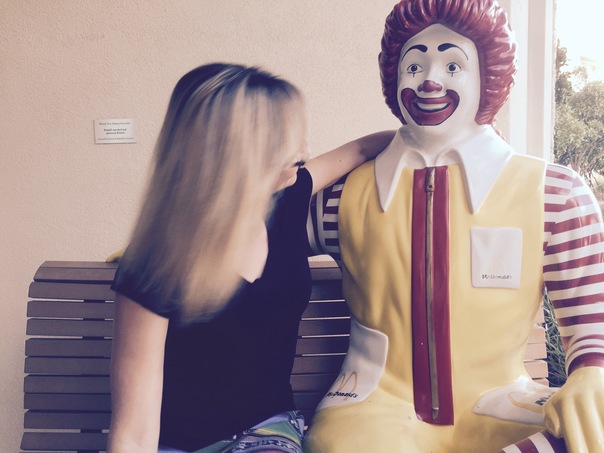 This is a picture of a lady with her arm around a statue of Ronald McDonald.