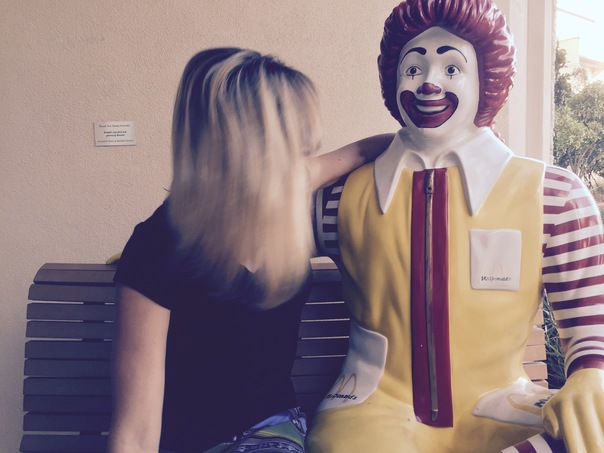 Jen, with her tiny frame, looked almost like a child sitting next to the colorful life-size Ronald McDonald statue.