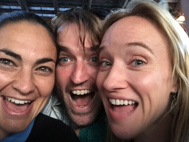 In this photo, two women and one man are smiling with open mouths in apparent laughter or mock laughter.