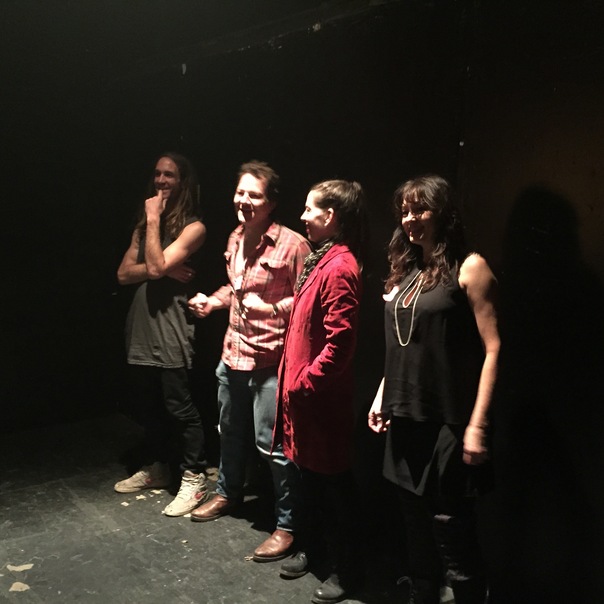 Young adults standing on a stage with a black backdrop underneath a single stage light smiling.