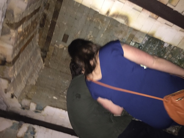 A woman in blue, with a tan purse over her shoulder, and another person in a gray-ish shirt or jacket are looking down at something in a bricked area.