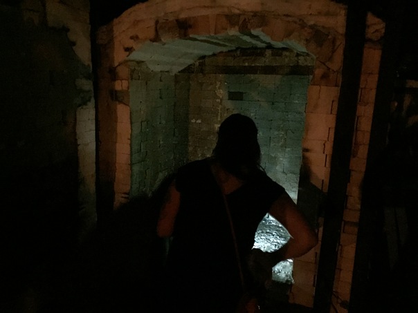 The person in the underground area is looking at the lit brick arch.