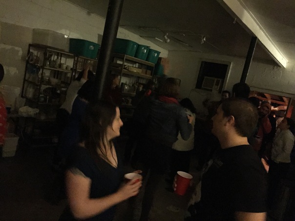 THERE ARE PEOPLE IN A DARK GARAGE HOLDING RED CUPS AT A PARTY.