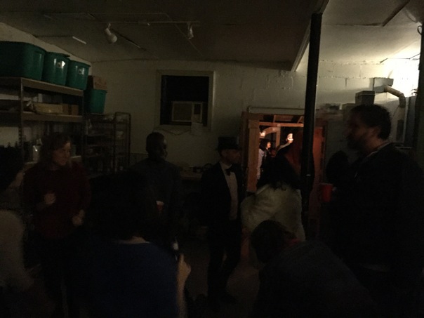 A man in a tux and hat and a woman dressed in white stand amid a group of people in a dimly lit storage area.