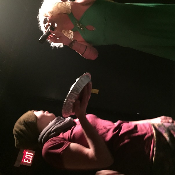A blonde woman in a elegant green dress is holding a microphone while another person is standing with a pie in her hand.