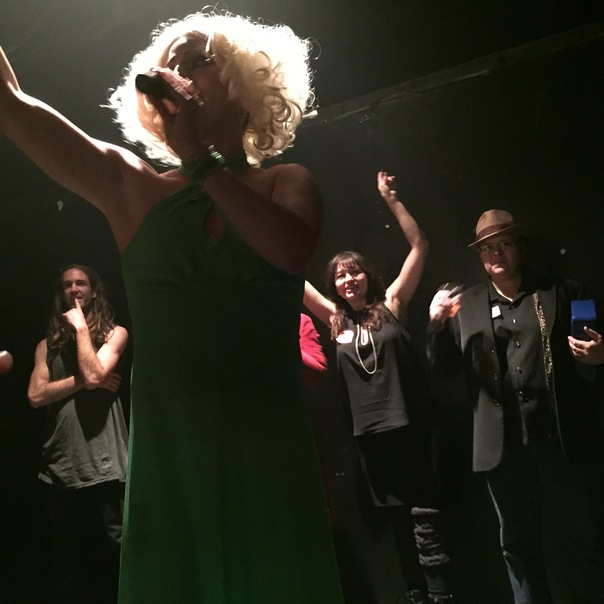 A woman in a green dress standing on a stage while holding a mic.
