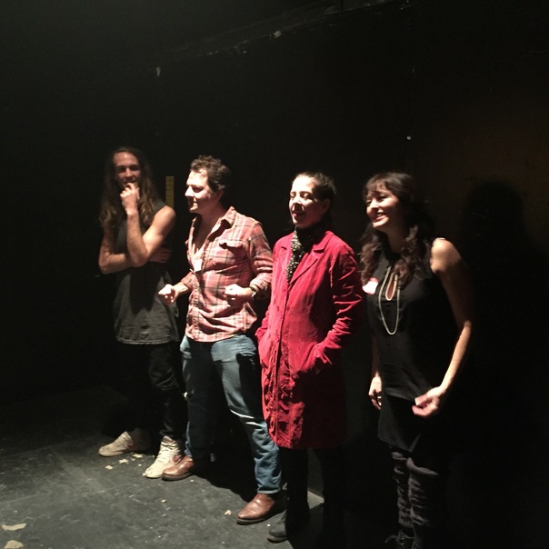 This is a photo of four individuals standing in a dark room under the spotlight.