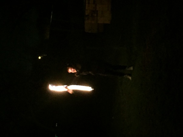 Night time long exposure of a man waving a light source up and down.