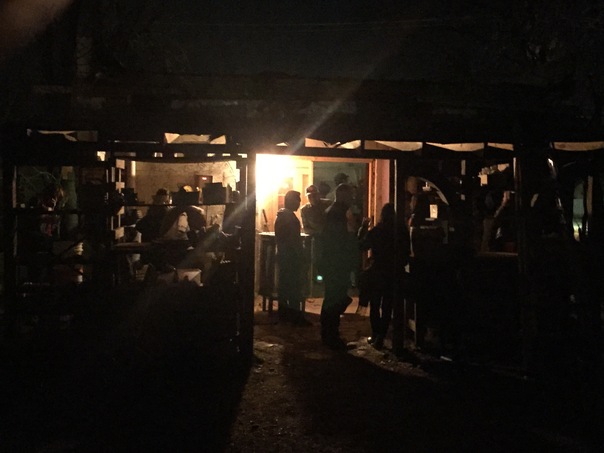 A crowd of people standing around a patio under a bright light.