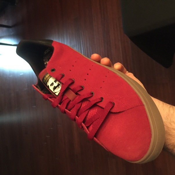 A hand holding up a red shoe with red laces.