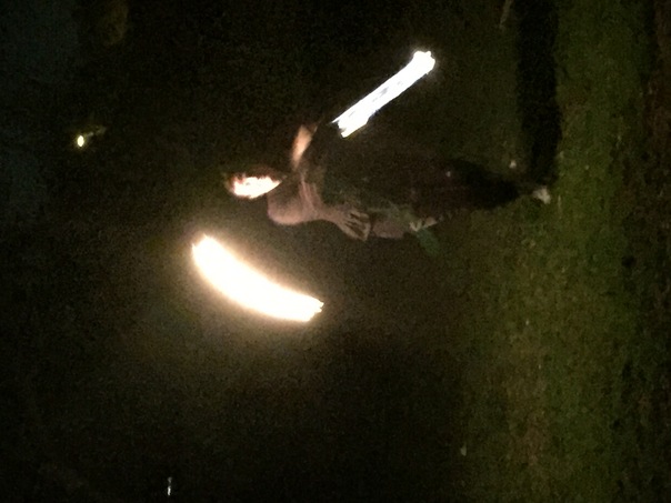 Man swings around lights in the dark while wearing fancy suit.