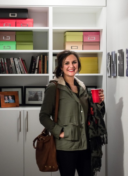 A woman with brown hair and wearing a green coat is holding a red plastic cup and scarf.