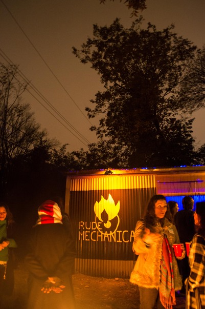 Looks like a gathering of people in the frigid night by a building with, "Rude Mechanical" sign on it.