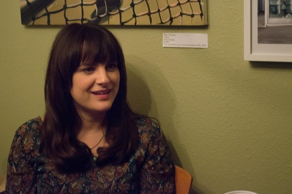 A woman with long dark brown hair is sitting by a wall.