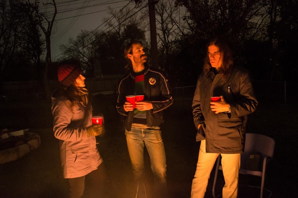 This is a picture of three people, two men and one woman, socializing and drinking.