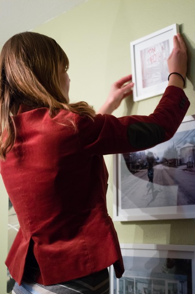 A woman is hanging a photograph in a red blazer in this picture.