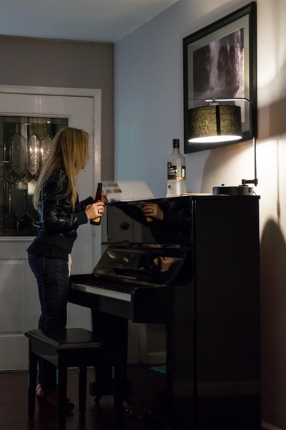 A woman dressed in black is standing near a piano reading with a glass bottle in her hand.