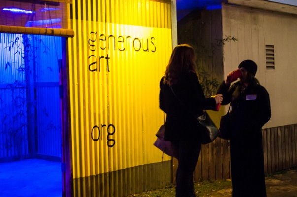 Two shadowy people stand in front of a bright yellow sign that says generous art org which is beside an entrance lit in bright blue.