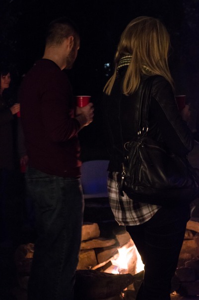 A man and woman are holding red plastic cups and standing near a fire.