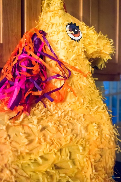 This is a very zoomed in picture of bright yellow piñata of a unicorn, with orange pink and purple hair on it.