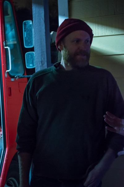 A darker image of a man who is wearing a hat and scruffy beard, looks into the distance as the photo is taken.