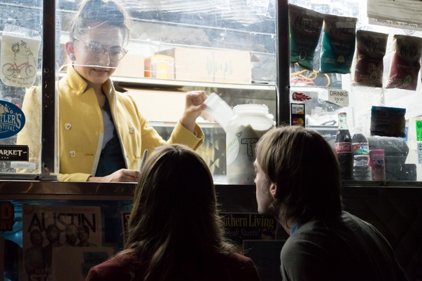 A young couple ordering something from a yellow clad woman on a food truck.
