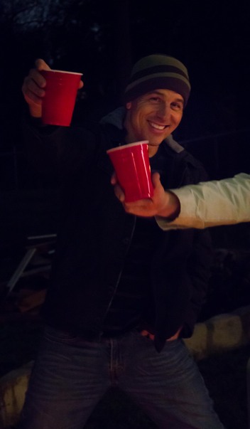 This picture shows a man extending his arm holding a red plastic cup as if he were toasting to something with another person also holding a cup out.