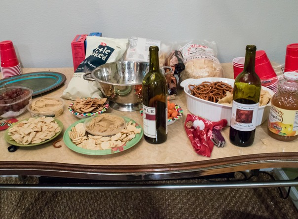 Table featuring various party snacks including potato chips, tortilla chips, crackers, pretzels and dips in addition to red solo cups and bottles of wine.