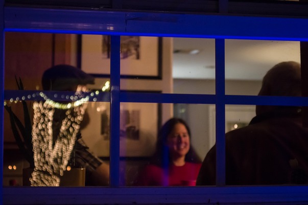 This is a picture of a blue window frame, behind the window you can see a happy woman in a red shirt.