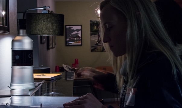 A female college student studies at a desk under lamp light.