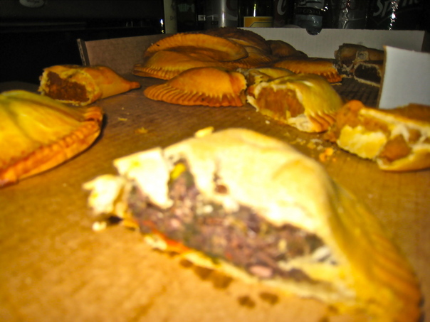 Golden brown,meaty empanadas sit in a box with a slightly blurry one sitting in the foreground.