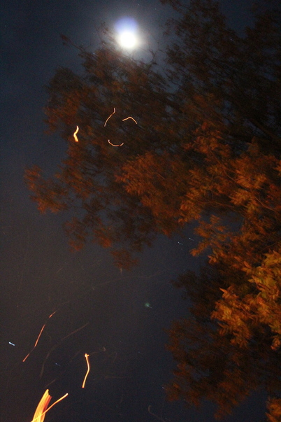 The moon shines in the dark sky through the trees.