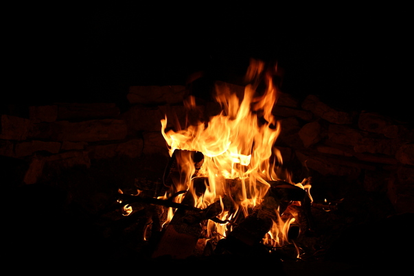 A fire burning brightly at night inside of a rock enclosed fire pit.