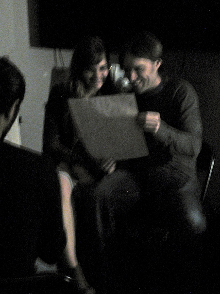 A young couple wearing dark clothes looks at a large white paper in a dimly lit room.