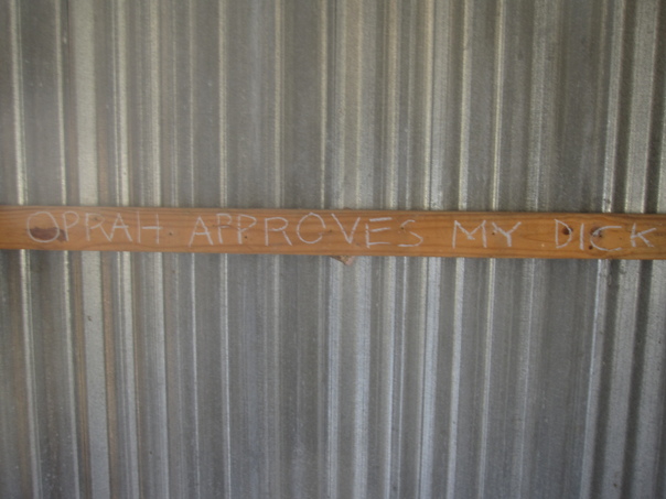 An incredibly crude comment written in white on an unfinished board attached to a metal wall.