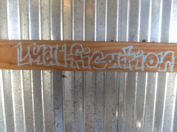 The word 'ludification' is written in blue chalk on a piece of wood.