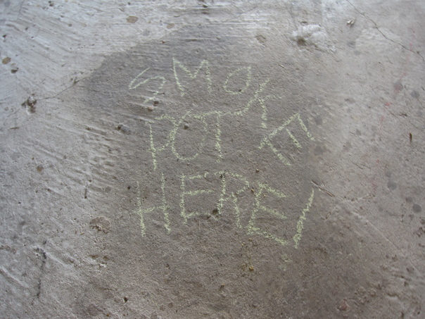 Written in sidewalk chalk, on plain grey concrete, are the words "SMOKE POT HERE!"