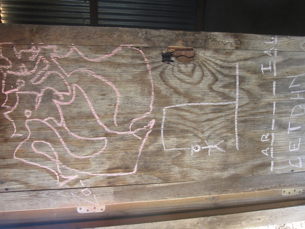 The unpainted, hinged wood has pink graffiti scrawled on the front.