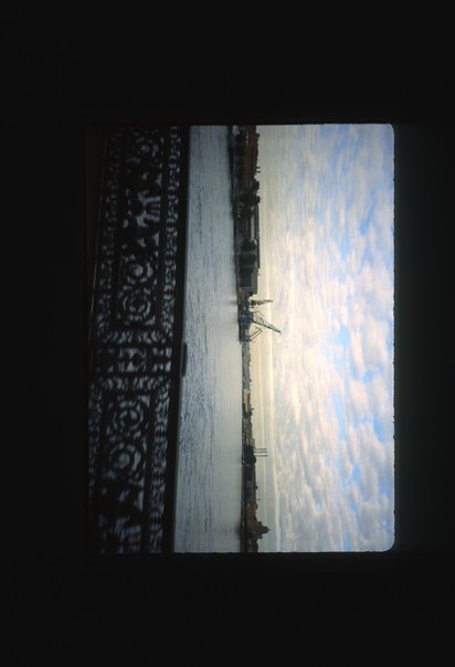 Some docks set against a cloudy blue sunset sky with grey blue water in the foreground. |