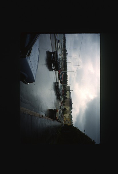 A gloomy, gray, rain-swept drive down a sodden city street. |