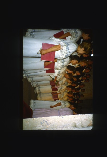 Doing prayer in a church with perfect dress code. lot of people is there. |