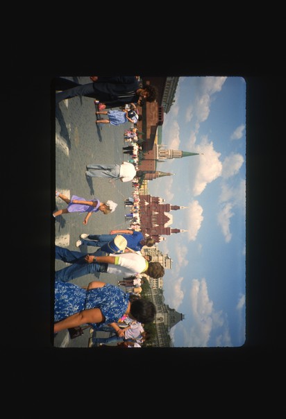 woman, dress, blue, sky, clouds, fluffy, walking, looking, buildings, tall, towers, tourist, cement, |