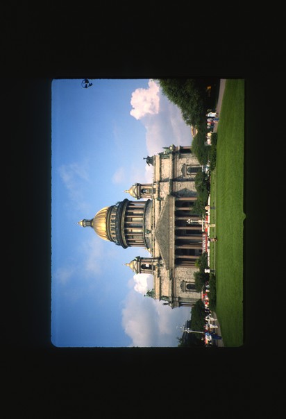 You are in a darkened room looking at the projected image of what appears to be a photograph of a rather austere looking building taken on a lovely summer's day.