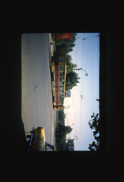 trolly, cab, yellow, red, travel, moving, transportation, public, wires, city, street, going, light post, windows, trunk, brake light, stop lights, |